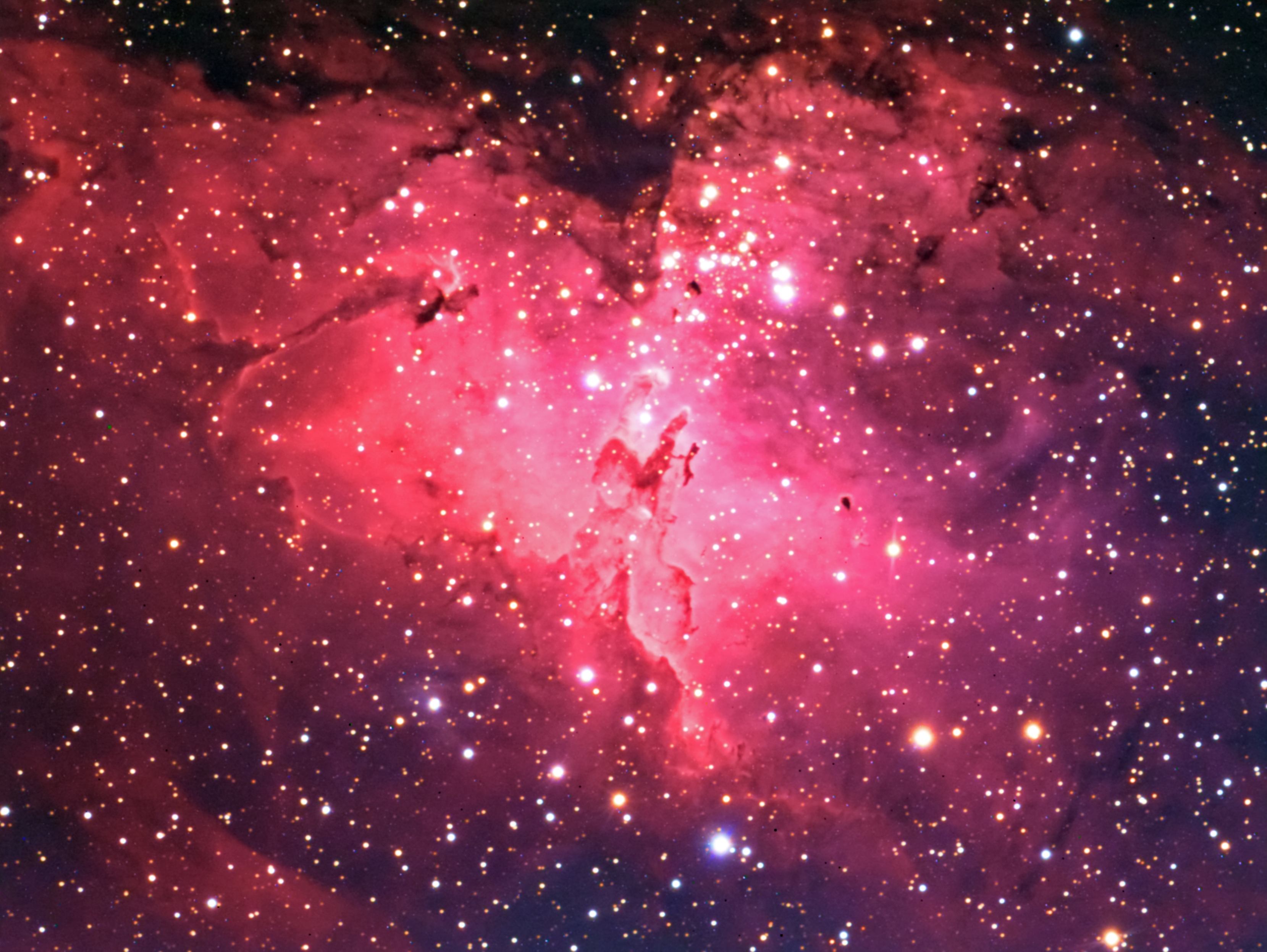 M16鹰状星云在梅西耶星表中排名16,因此简称为M16,它位于巨蛇座,是银河系的一个恒星诞生区由于其形状好像一只展翅翱翔的雄鹰而得此名。其中的创生之柱,更是哈勃太空望远镜拍摄的最佳照片之一。该区域拥有大片星际气体和尘埃,正处于活跃的恒星形成过程之中。M16和老鹰星云距离我们大约7000光年远,是双筒望远镜或小型望远镜容易看到的一个目标。
