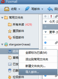 然后选择收件箱,选择导入,将原来备份的eml文件全部选中,导入: