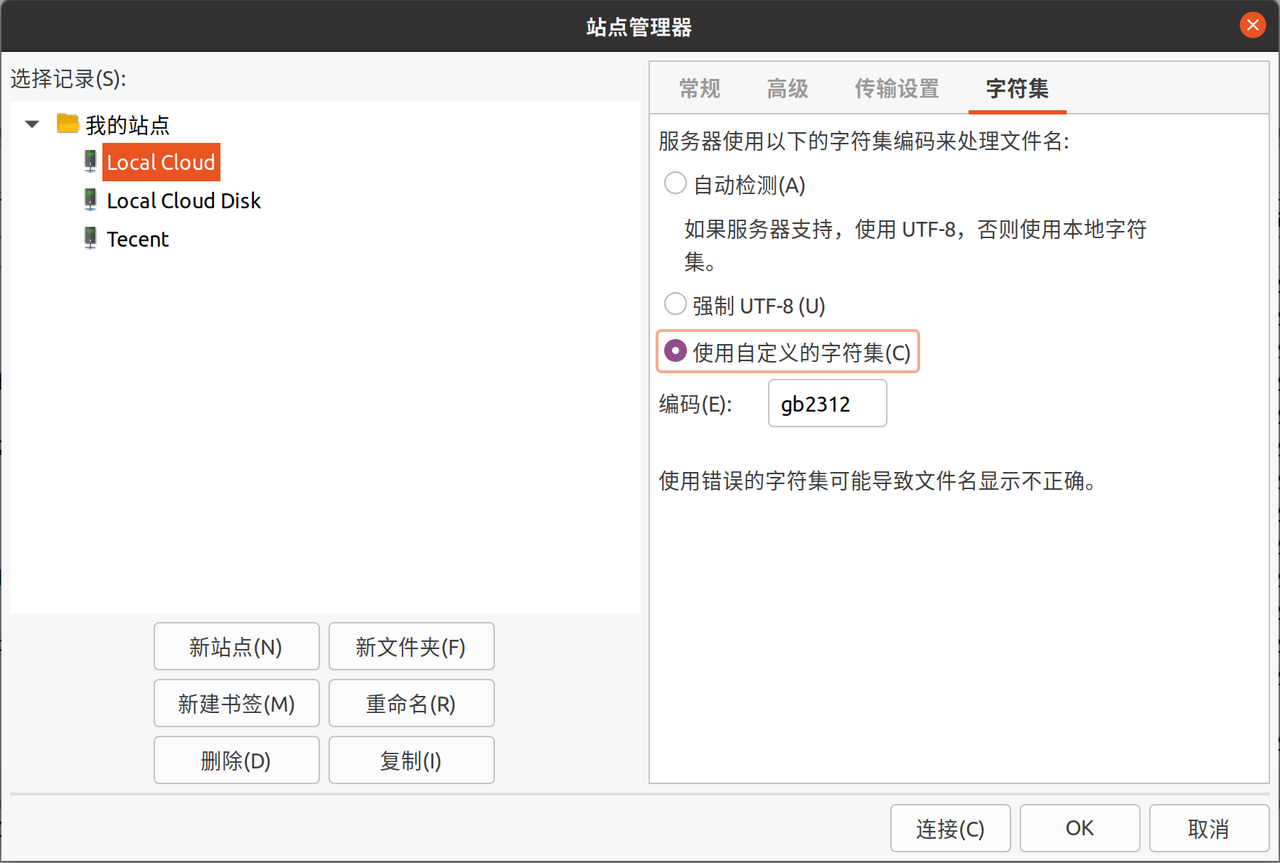 字符集栏中,选择使用自定义的字符集(C),在编码(E)对应的文本框中输入gb2312,如下图所示,如果还有乱码,试试其他的编码,比如gb18030