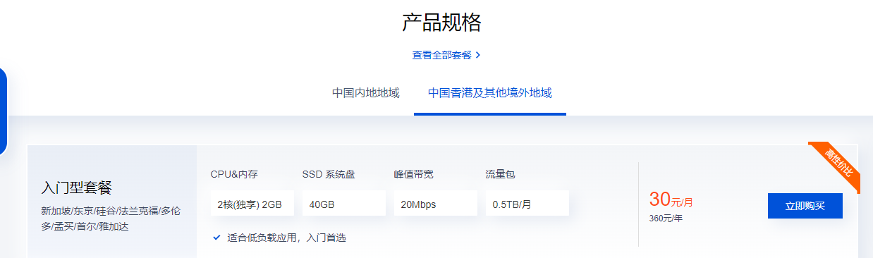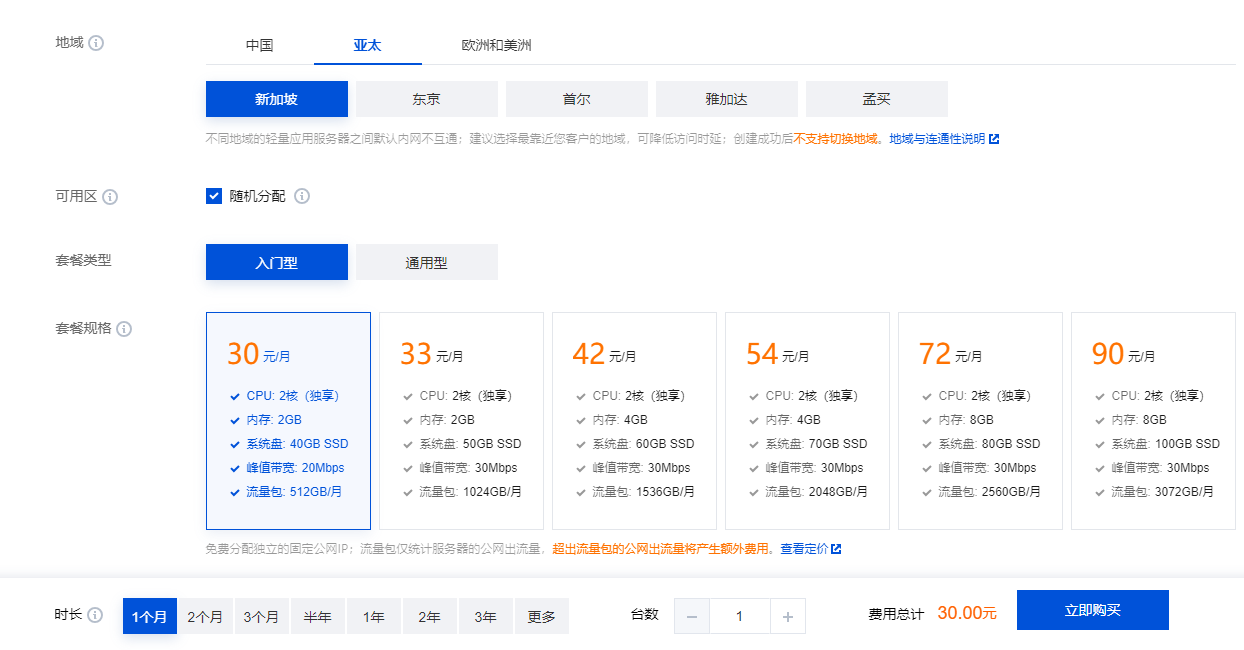 地点选择亚太,新加坡,30元/月即可,也可以升级到其他档次。