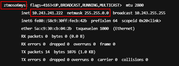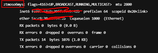 输入ifconfig,即可知道zerotier对应的虚拟网卡名称,以及分配的IP地址的子网掩码,记住这些信息,下面会用到。