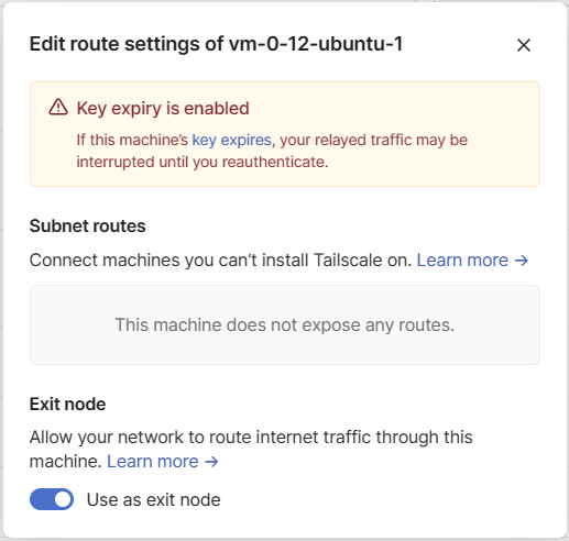 在tailscale后台就会出现这台服务器,exit node上面有个感叹号,说明没有启用。