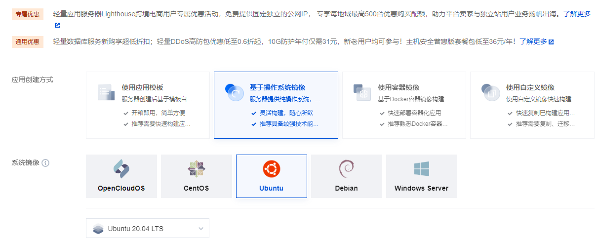 选择基于操作系统镜像,选择Ubuntu 20的版本。