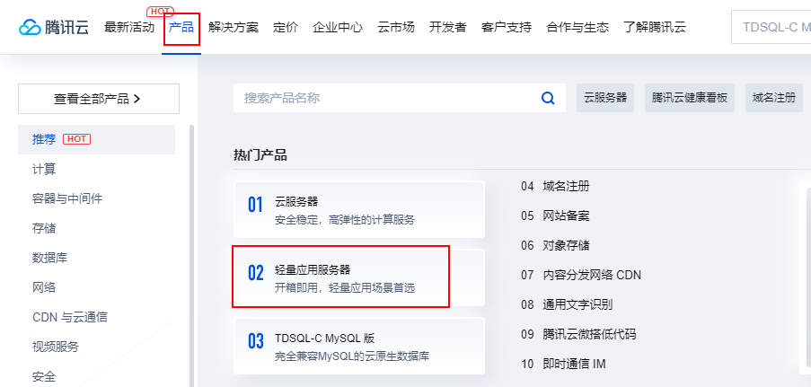 选择产品->轻量应用云服务器