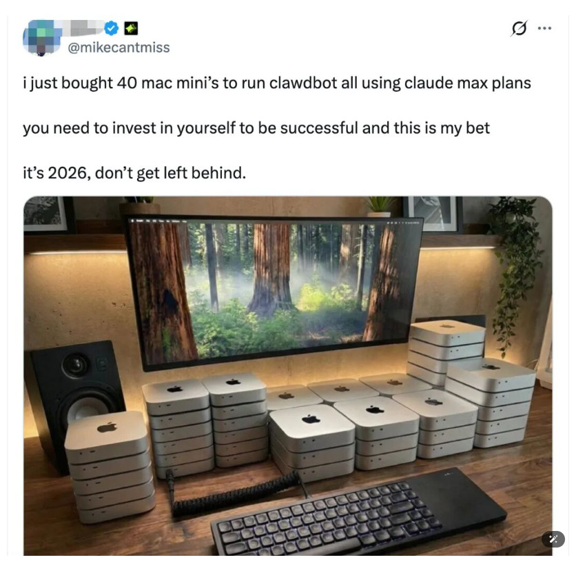 这人很可能在搭建一个“分布式 Claude 自动化农场”。买 40 台 Mac mini,每台登录一个 Claude Max 账号,通过 Clawbot(通常基于 Playwright/Puppeteer 的浏览器自动化)控制网页端 Claude 批量生成内容。目的通常是:
