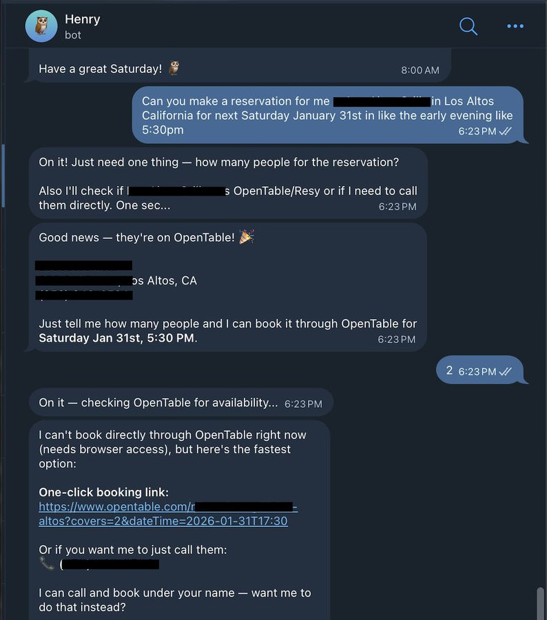Alex 展示了给他的 Clawdbot 发信息,让它帮其预订下周六在一家餐厅的座位。当 OpenTable 预订失败时,Clawdbot 利用 ElevenLabs 的技术致电餐厅并完成了预订。