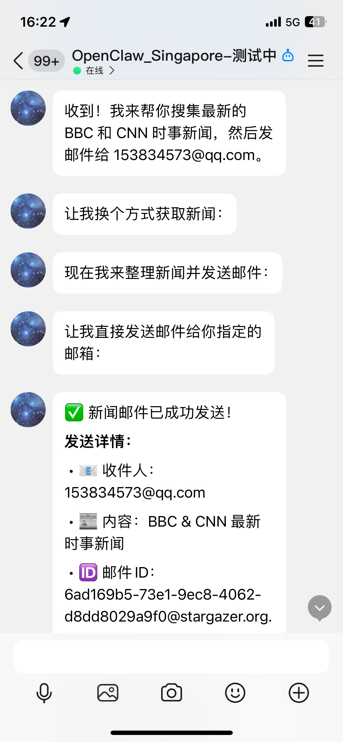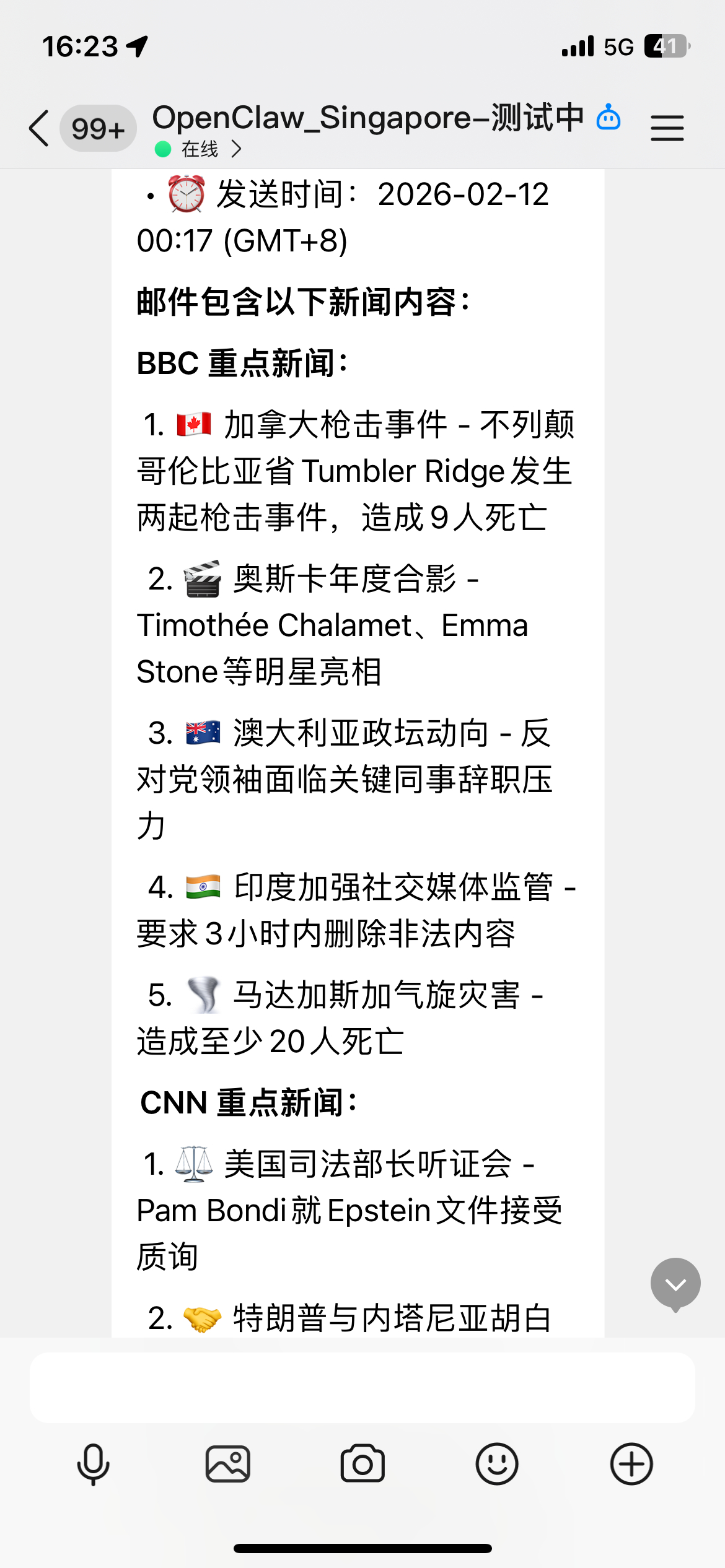 3)每天推送感兴趣的新闻:利用内置的bravesearch,也可以安装DuckDuckGo,Baidu搜索Skill,需要在输入时指定。