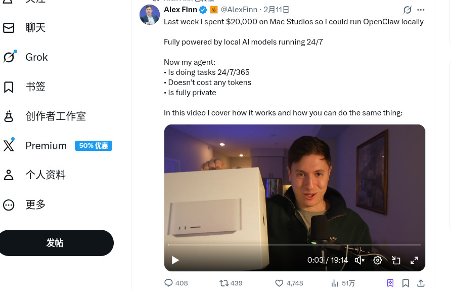 注意:Mac Studio的内存是统一内存架构(Unified Memory Architecture),CPU / GPU / Neural Engine 共用同一块内存,没有独立显存 GPU 可以直接使用全部 512GB, 这对大模型运行非常关键。用 512GB Mac Studio,他可以跑: