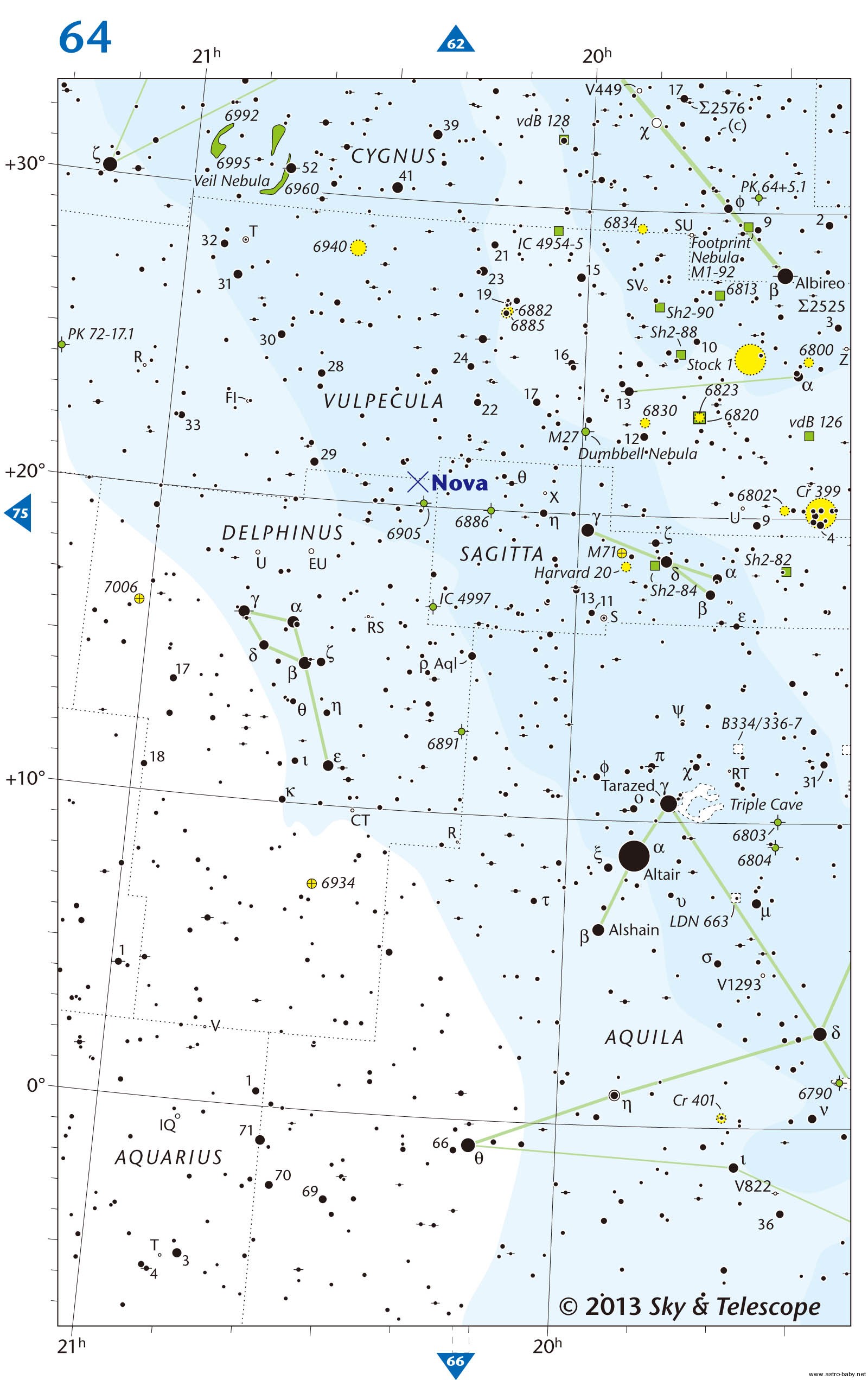 这颗新星位于海豚座、天箭座和狐狸座交界处(S&T星图链接),非常容易找到。