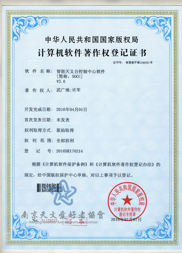 OCC团队智能天文台控制中心软件获得了软件著作权: